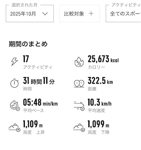 10月の走行距離、結果ドーン 322km。 うん、数字だけ見るとめっちゃ走ってるはずなんだけど…昨年の自分(368km)が強すぎて震えるww 10月はマラソン2発。 弘前・白神アップルで派手に撃沈して「りんごどころじゃねぇ」ってなったけど、金沢でなんとか意地…