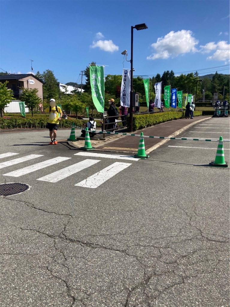 82.8kmグリーン薬局エイド。ここのエイドは通り沿いになく、少し中に入らなければならない。なるべくロスは避けたいので、入口で被り水だけして先に進む。