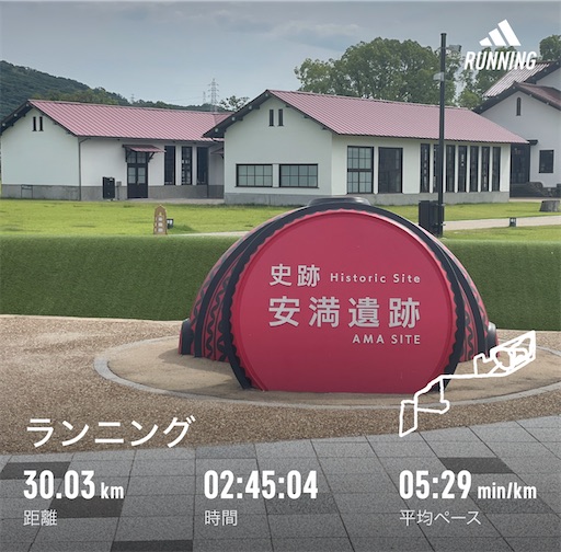 8時前に到着して走り始めたんだけど、安満って日差しを遮る場所がないからとにかく暑い。後半、日が陰ってきたけど、湿度がまとわりついてやっばり辛い。
